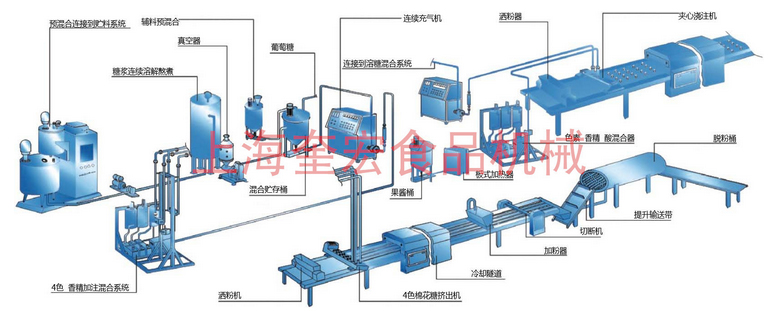 連續式棉花糖生產線可以生產不同形狀和顏色的擠出成型棉花糖產品,也可生產果醬夾心的澆注成型棉花糖產品。